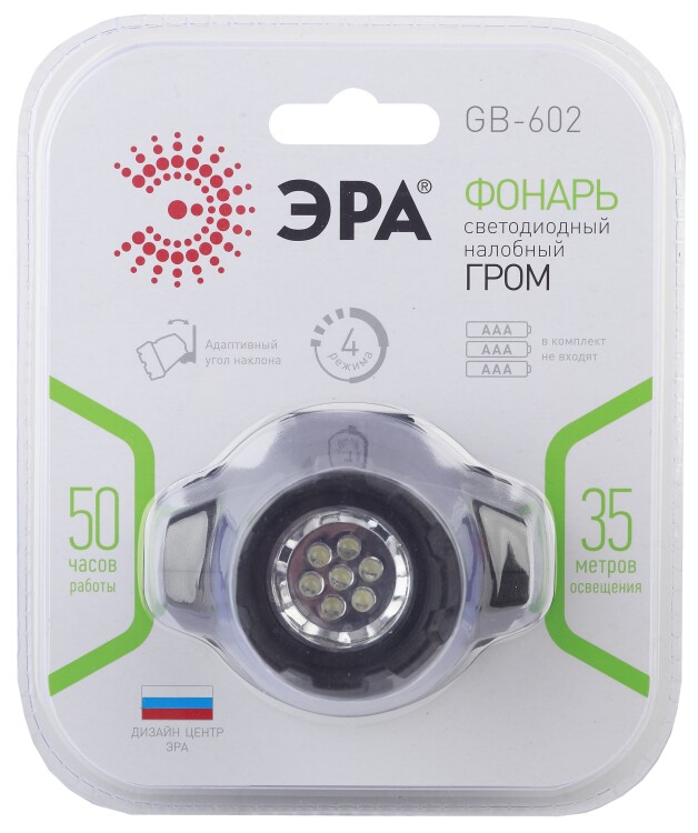 Налобный светодиодный фонарь GB-602 "ГРОМ" с длительным временем автономной работы. Фонарь питается от батареек типа ААА и работает, не требуя заряда 10 часов на полной мощности. Фонарь оснащён 7 яркими светодиодами, которые дают белый свет. Дальность луча составляет 35 метров. Фонарь работает в 4 режимах. Также модель GB-602 сделана из ударопрочного пластика, усиленного специальным покрытием "Шагрень", которое дополнительно защищает корпус от механических повреждений и отвечает за стильный внешний вид. Разработка дизайн-центра ЭРА получила награду в конкурсе промышленного дизайна. Новое покрытие защищает фонарь от царапин, а также не скользит в руках и очень приятно на ощупь. Также фонарь имеет адаптивный угол наклона для максимально комфортного использования. Налобный фонарь незаменим в ситуациях, когда необходим дополнительный источник освещения и, в тоже время, свободные руки. Долгая работа без дополнительной подзарядки гарантирует, что фонарь не откажет внезапно в ситуации, когда свет просто необходим. Такой фонарь станет практичным и надёжным помощником не только на природе, но и в бытовых ситуациях, например, в гараже или на даче. Главными преимуществами фонаря являются длительно срок автономной работы, качественный белый свет, 4 режима работы, адаптивный угол наклона, прочный корпус и интересный дизайн.