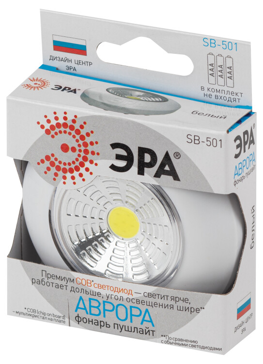 Фонарь SB-501 пушлайт "Аврора" - светодиодный самоклеящийся фонарь-подсветка, который включается простым нажатием руки. В фонаре использованы светодиоды нового поколения, который светят мягким светом, не мерцают, не нагреваются и имеют длительный срок службы, не нуждаются в замене. Эти светодиоды светят ярким белым светом и намного энергоэффективнее обычных. Дальность луча составляет 5 метров.Это удобный и практичный фонарь, который можно использовать для декоративного освещения в качестве подсветке или как аварийный свет. Фонарь выполнен в лаконичном дизайне в базовом белом цвете из ударопрочного экологичного пластика. Фонарь не требует установки, достаточно отклеить стикер от самоклеящейся поверхности и приклеить фонарь туда, где требуется дополнительное освещение. Компактные размеры позволяют приклеить фонарь на любые плоские поверхности, такие как лестницы, коридоры, прихожие, шкафы, тумбочки, кладовки. Он также подходит для машин, лодок и кемпинга. Фонарь работает от батареек, которые очень легко сменить, не отклеивая фонарь, а лишь открутив корпус.
