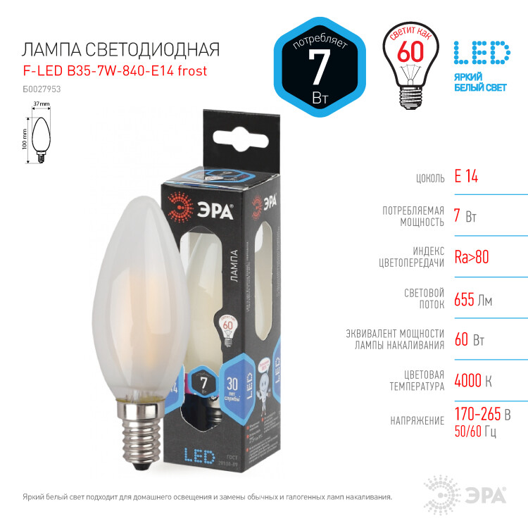 Лампа светодиодная F-LED B35-7W-840-E14 fros ЭРА (филамент, свеча мат., 7Вт, нейтр, E14) (10/100/2800)