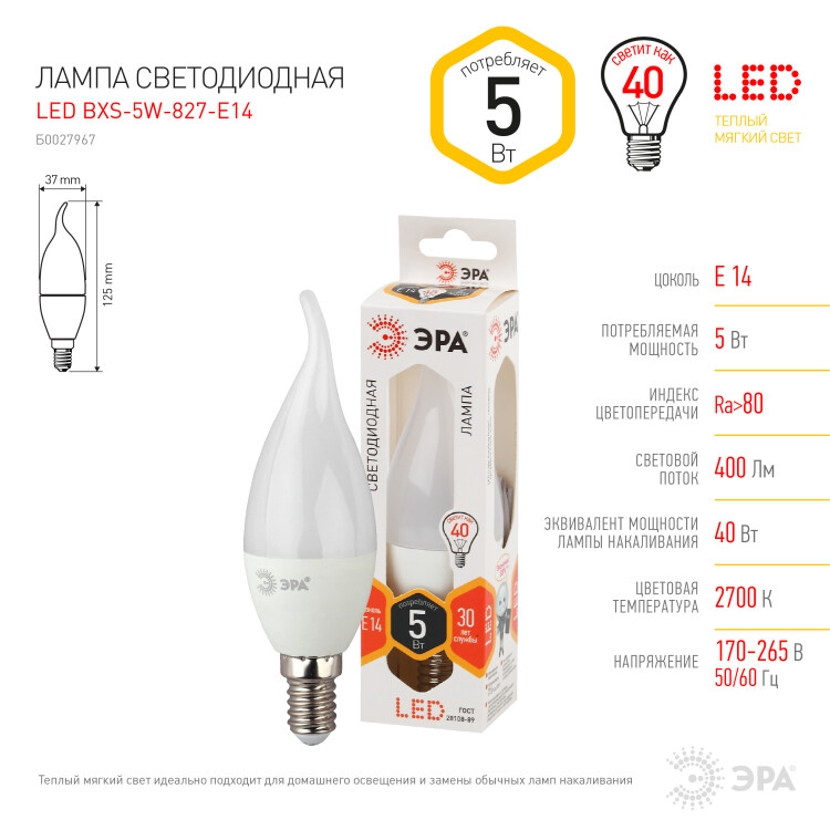 Бытовая светодиодная лампа ЭРА Серии Стандарт, создаёт яркое ровное освещение и экономит до 90% электроэнергии по сравнению с лампой накаливания с аналогичным световым потоком. Светит теплым светом с жёлтым оттенком - такая цветовая температура эффективна для отдыха и уютной атмосферы в доме. Используется в потолочных, настенных, настольных светильниках, в люстрах и бра. Мгновенно включается и не нагревается.
