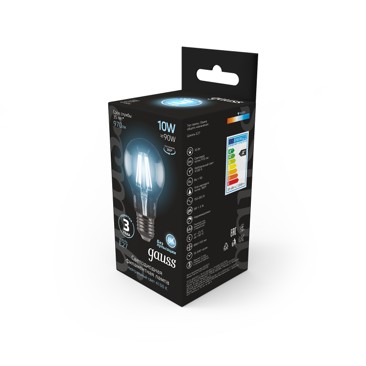 Лампа Gauss LED Filament A60 E27 10W 4100К 1/10/40 (кр.10шт)