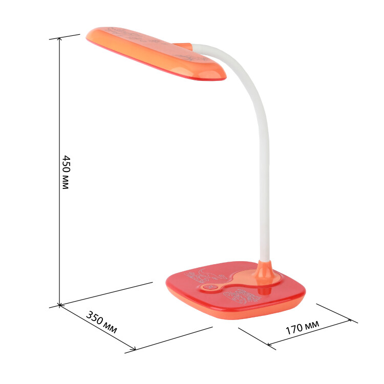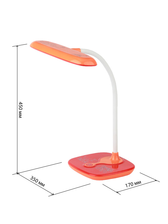 Настольный светильник для детей ЭРА NLED-432-6W-OR со светодиодами (LED) в качестве источников света. Оснащен сенсорным управлением, возможностью выбора цветовой температуры (теплый, нейтральный или холодный свет). Яркость регулируется при помощи плавного диммера. Удобный выбор направления света - наклон и поворот плафона в любом направлении. Яркий детский дизайн с веселым узором на основание оживит комнату и станет верным помощником для ребенка в учебе или творчестве.