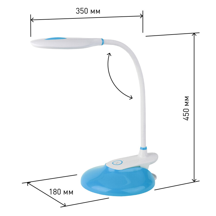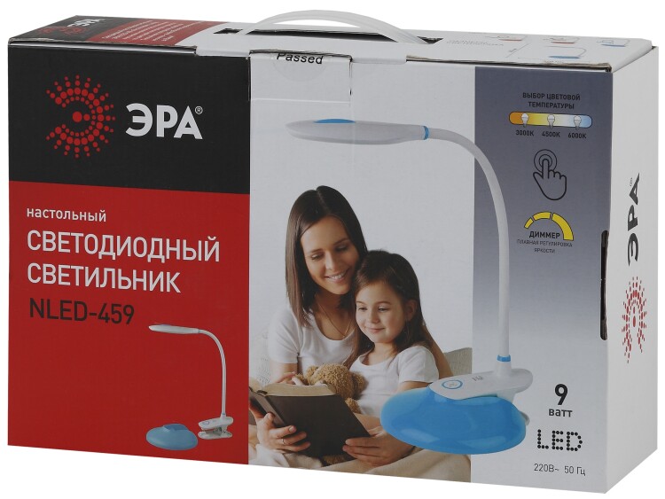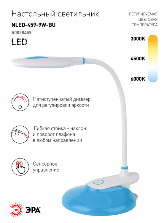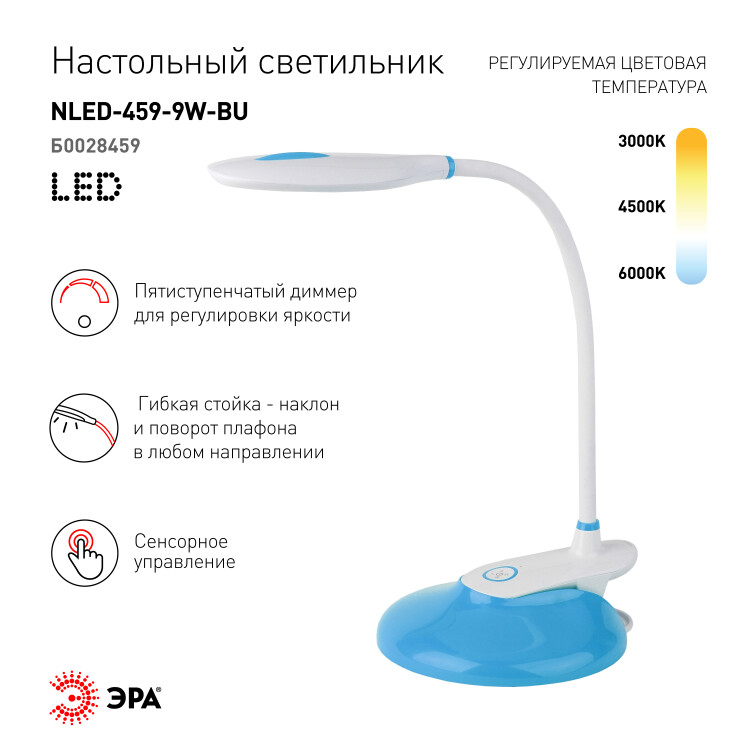 Настольный светильник ЭРА NLED-459-9W-BU со светодиодами (LED) в качестве источников света. Оснащен сенсорным управлением с возможностью выбора цветовой температуры (теплый, нейтральный или холодный свет). Есть регулировка яркости освещения, 5 уровней. Удобный выбор направления света - наклон и поворот плафона в любом направлении. Два варианта крепления: может быть использован как прищепка или как светильник на сновании - в комплект входит съемное основание-вставка. Просто прикрепите прищепку к съемному основанию - получится очень устойчивый вариант для размещения на плоской поверхности.