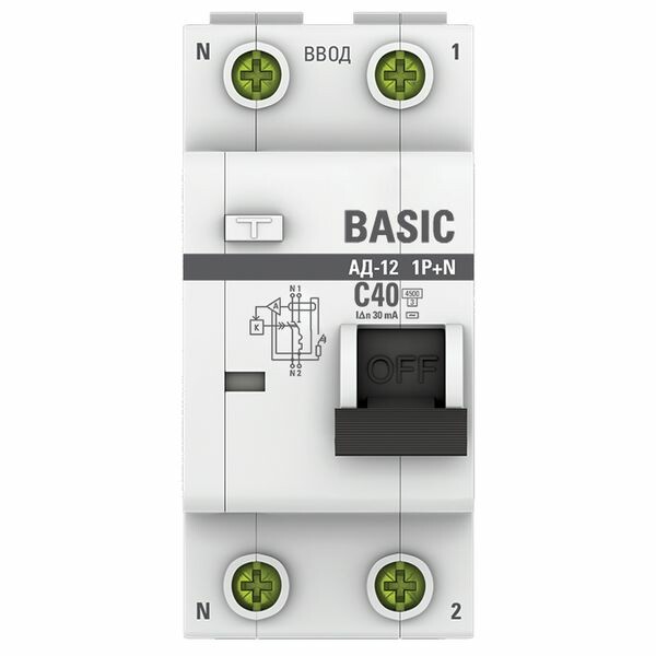 Автоматический выключатель дифференциального тока 1P+N 40А 30мА тип АС х-ка C эл. 4,5кА АД-12 Basic (кр. 1шт)