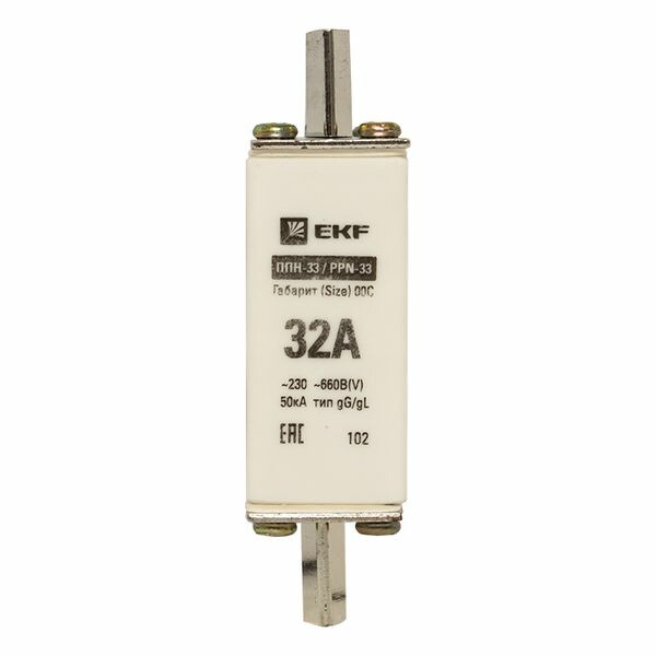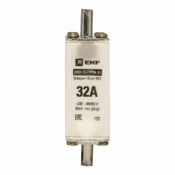 Плавкая вставка ППН-33 100/ 32А габарит 00С EKF. Предохранители плавкие ППН EKF, укомплектованные плавкими вставками типа gG/gL, предназначаются для защиты кабельных линий и промышленных электроустановок от токов перегрузки и короткого замыкания. Предохранители применяются в электрических сетях переменного тока частотой 50 Гц с напряжением до 660В. Применяются для крепления в распределительных и вводно-распределительных устройствах. Предохранители плавкие ППН могут устанавливаться в основание с держателем, а также в специально предназначенные рубильники. В комплект поставки предохранителей плавких ППН основание с держателем не входит и приобретается отдельно.