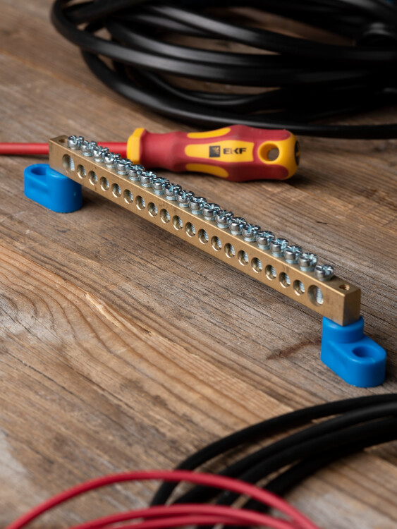 Шина "0" N (8х12мм) 20 отверстий латунь 2 синих угловых изолятора EKF PROxima (кр. 100 шт)