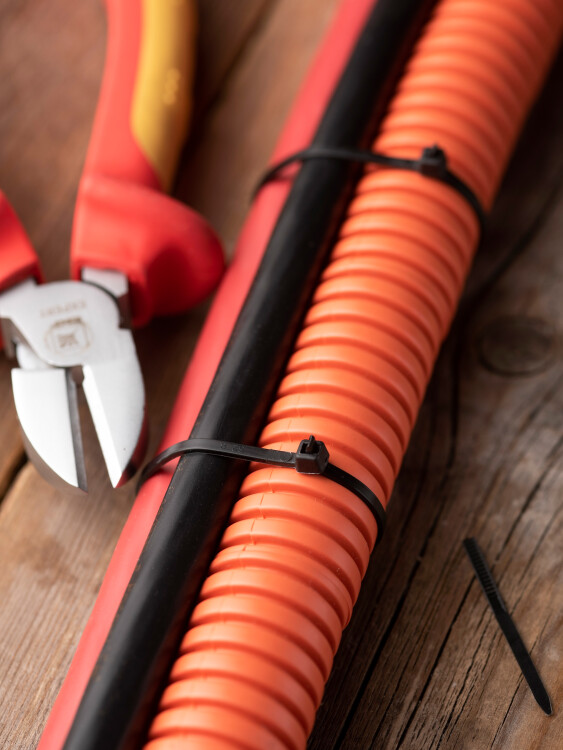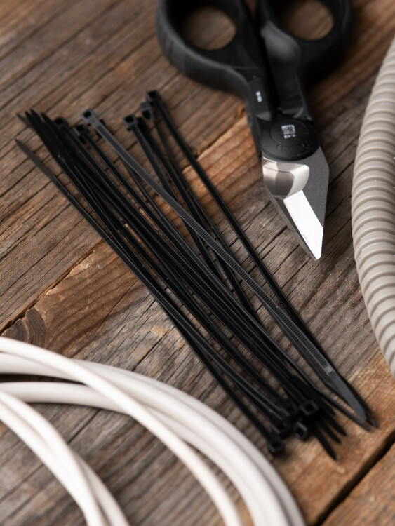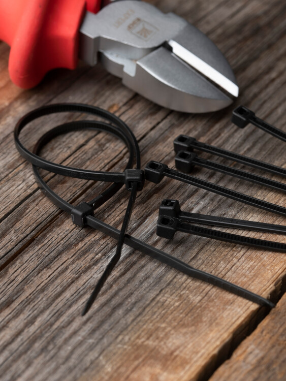 Предназначен для увязки кабелей и проводов в пучок и монтажа кабельных линий и проводников. Ремешок самофиксирующийся, блокирующий механизм. Изготовлен из Nylon 6.6, устойчивого к старению, коррозии, воздействию солей, ультрафиолета, кислот, щелочей, спирта, бензина и масел. При производстве кабельных стяжек черного цвета добавляется угольный порошок, который является одним из наиболее эффективных стабилизаторов. Он улучшает физические свойства продукции в стойкости к погодным условиям и УФ-излучению (прямые солнечные лучи).