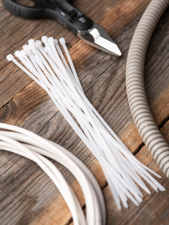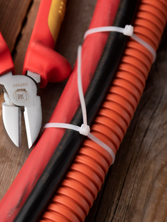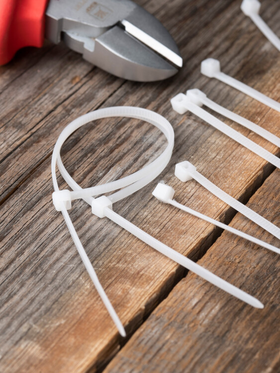 Предназначен для увязки кабелей и проводов в пучок и монтажа кабельных линий и проводников. Ремешок самофиксирующийся, блокирующий механизм. Изготовлен из Nylon 6.6, устойчивого к старению, коррозии, воздействию солей, ультрафиолета, кислот, щелочей, спирта, бензина и масел. При производстве кабельных стяжек черного цвета добавляется угольный порошок, который является одним из наиболее эффективных стабилизаторов. Он улучшает физические свойства продукции в стойкости к погодным условиям и УФ-излучению (прямые солнечные лучи).