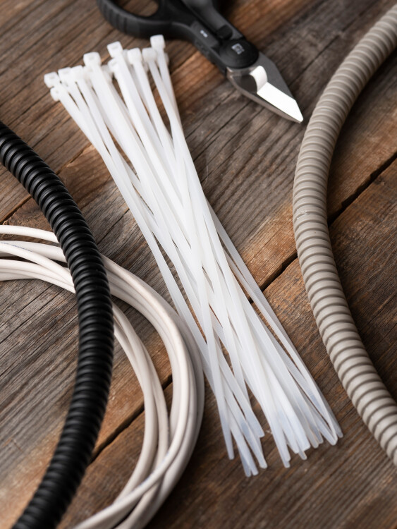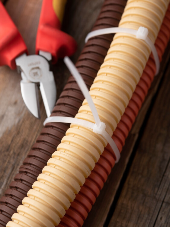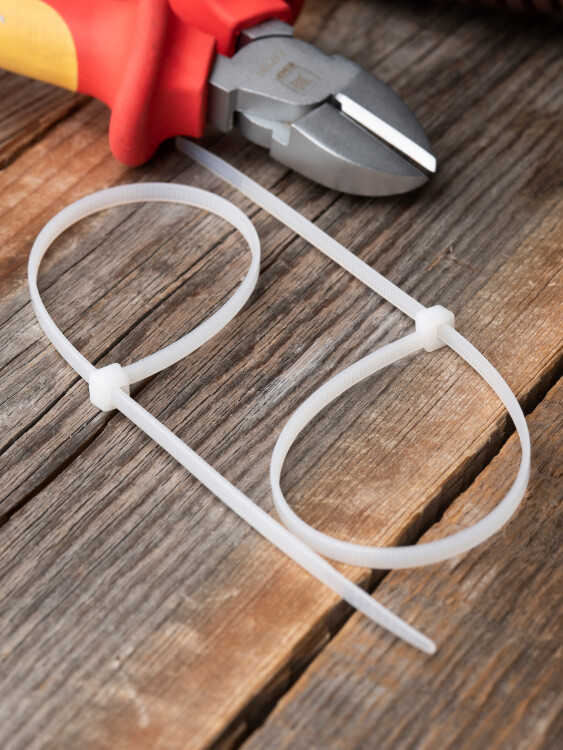 Предназначен для увязки кабелей и проводов в пучок и монтажа кабельных линий и проводников. Ремешок самофиксирующийся, блокирующий механизм. Изготовлен из Nylon 6.6, устойчивого к старению, коррозии, воздействию солей, ультрафиолета, кислот, щелочей, спирта, бензина и масел. При производстве кабельных стяжек черного цвета добавляется угольный порошок, который является одним из наиболее эффективных стабилизаторов. Он улучшает физические свойства продукции в стойкости к погодным условиям и УФ-излучению (прямые солнечные лучи).