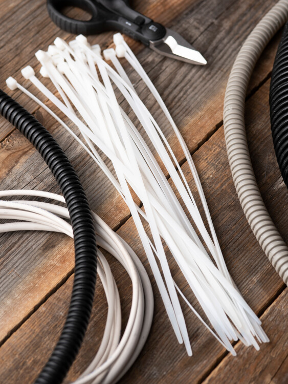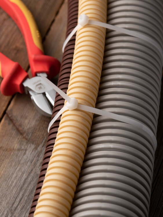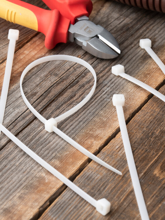 Предназначен для увязки кабелей и проводов в пучок и монтажа кабельных линий и проводников. Ремешок самофиксирующийся, блокирующий механизм. Изготовлен из Nylon 6.6, устойчивого к старению, коррозии, воздействию солей, ультрафиолета, кислот, щелочей, спирта, бензина и масел. При производстве кабельных стяжек черного цвета добавляется угольный порошок, который является одним из наиболее эффективных стабилизаторов. Он улучшает физические свойства продукции в стойкости к погодным условиям и УФ-излучению (прямые солнечные лучи).