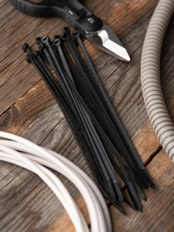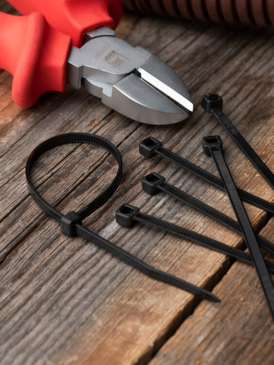 Предназначен для увязки кабелей и проводов в пучок и монтажа кабельных линий и проводников. Ремешок самофиксирующийся, блокирующий механизм. Изготовлен из Nylon 6.6, устойчивого к старению, коррозии, воздействию солей, ультрафиолета, кислот, щелочей, спирта, бензина и масел. При производстве кабельных стяжек черного цвета добавляется угольный порошок, который является одним из наиболее эффективных стабилизаторов. Он улучшает физические свойства продукции в стойкости к погодным условиям и УФ-излучению (прямые солнечные лучи).