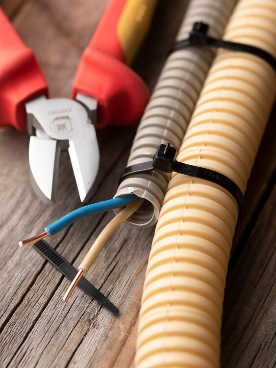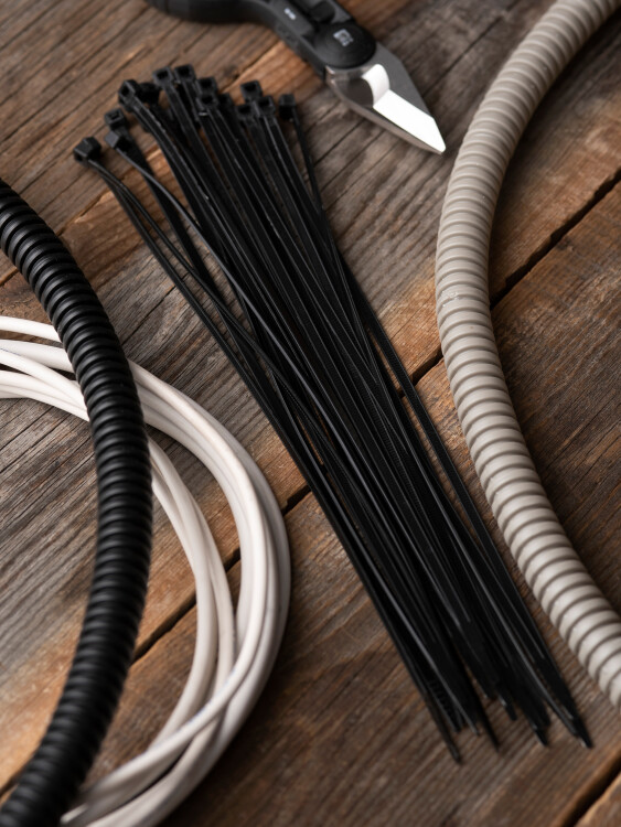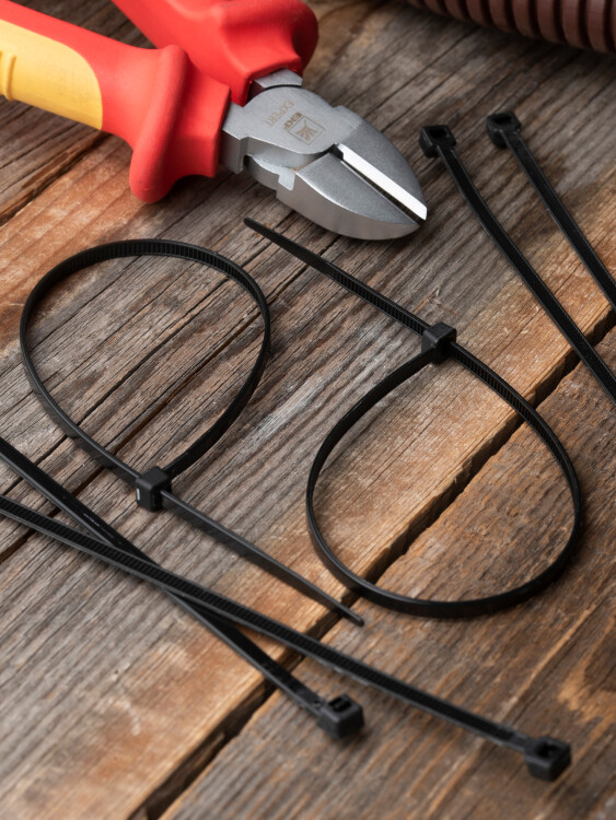 Предназначен для увязки кабелей и проводов в пучок и монтажа кабельных линий и проводников. Ремешок самофиксирующийся, блокирующий механизм. Изготовлен из Nylon 6.6, устойчивого к старению, коррозии, воздействию солей, ультрафиолета, кислот, щелочей, спирта, бензина и масел. При производстве кабельных стяжек черного цвета добавляется угольный порошок, который является одним из наиболее эффективных стабилизаторов. Он улучшает физические свойства продукции в стойкости к погодным условиям и УФ-излучению (прямые солнечные лучи).