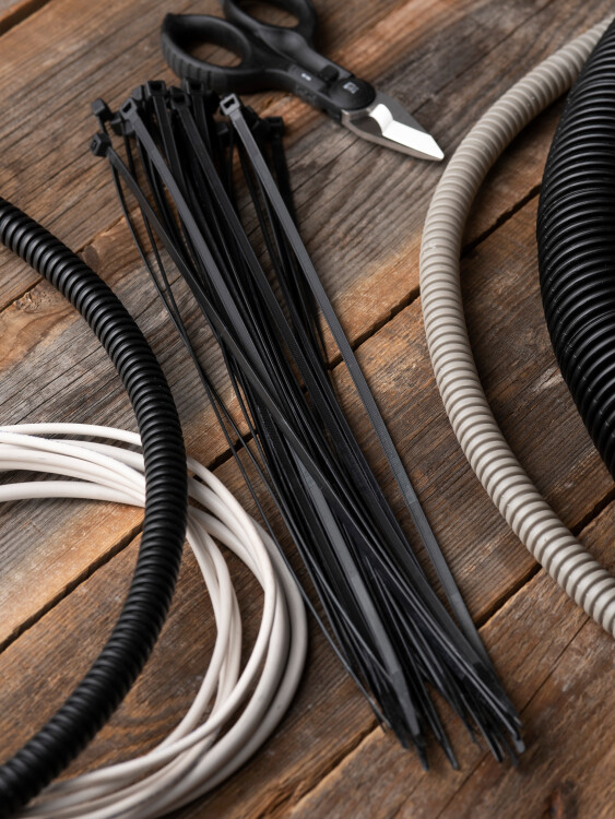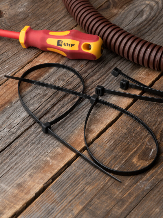 Предназначен для увязки кабелей и проводов в пучок и монтажа кабельных линий и проводников. Ремешок самофиксирующийся, блокирующий механизм. Изготовлен из Nylon 6.6, устойчивого к старению, коррозии, воздействию солей, ультрафиолета, кислот, щелочей, спирта, бензина и масел. При производстве кабельных стяжек черного цвета добавляется угольный порошок, который является одним из наиболее эффективных стабилизаторов. Он улучшает физические свойства продукции в стойкости к погодным условиям и УФ-излучению (прямые солнечные лучи).