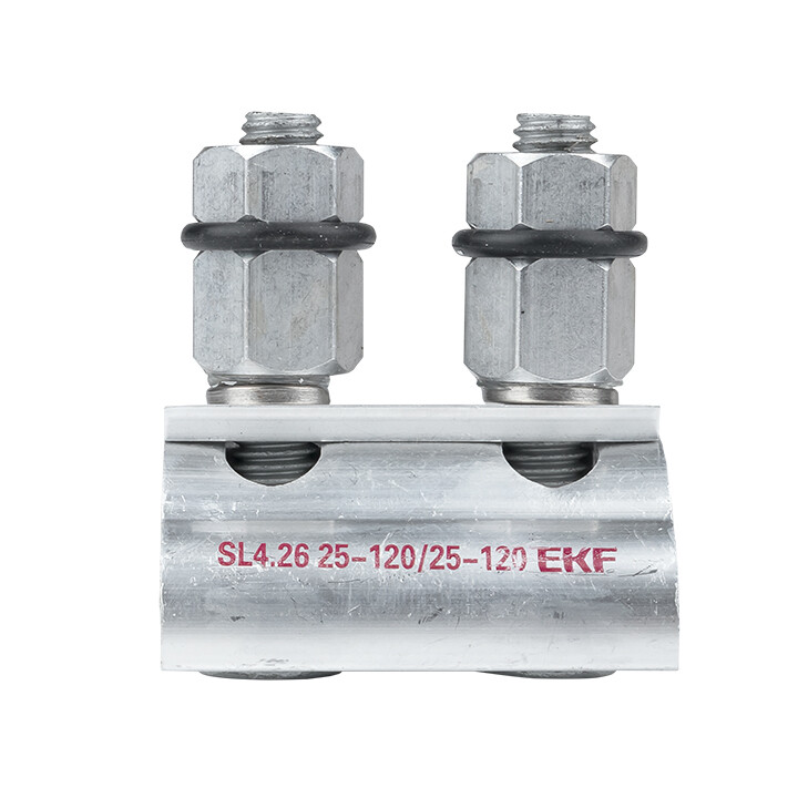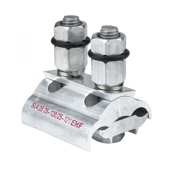 Зажим типа sl-4.26 предназначен для создания электрического соединения неизолированных алюминиевых или стальных проводов. Контакт между проводами осуществляется прижимной пластиной. При достижении момента, необходимого для создания надежного электрического контакта проводов, происходит срыв головки болта. Имеет два болта для увеличения прижимного усилия.