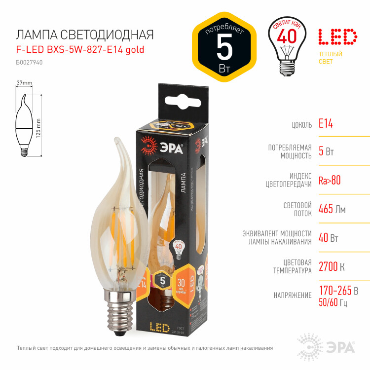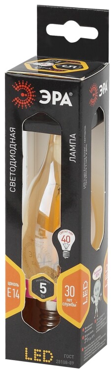 Филаментная светодиодная лампа ЭРА F-LED BXS-5W-827-E14 gold оригинальной формы «свеча на ветру». Золотистое покрытие колбы и нитевидные светодиоды «под старину» смотрятся очень эффектно. Эта лампочка – отличное решение для дизайнерских интерьеров, пространств в стиле лофт. Простой способ придать помещению «изюминку». Цоколь – Е14, потребляемая мощность – 5 Вт. Светит уютным тёплым светом. Размеры: 125 х 37 мм. Совместима с выключателем с подсветкой.