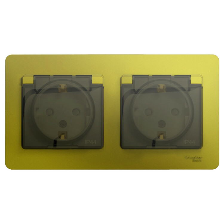 Розетка Systeme Electric (ранее Schneider Electric) серии Glossa (в сборе, цвет фисташковый) двойная с заземлением, шторками и крышкой подходит для сетей 250 В, на ток 16 А.