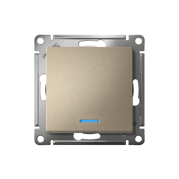 Механизм выключателя 1-клавишного с подсветкой Systeme Electric (ранее Schneider Electric) серии AtlasDesign в цвете шампан ь подходит для сетей 250 В, на ток 10 А. Благодаря светодиодной подсветке синего цвета изделие легко найти в темноте. Лицевые детали из качественного ABS-пластика, устойчивого к царапинам и УФ-излучению. Усиленные прямые монтажные лапки для лучшей фиксации механизма в монтажной коробке.