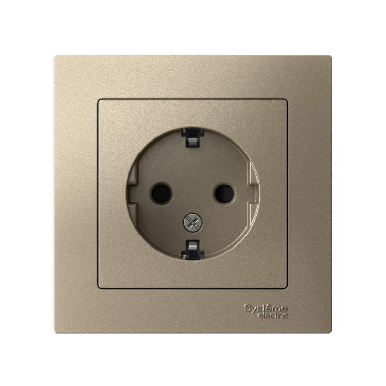 Розетка в сборе Systeme Electric (ранее Schneider Electric) серии AtlasDesign в цвете шампань одинарная с заземлением и без шторок подходит для сетей 250 В, на ток 16 А. Заземляющий контакт обеспечивает дополнительную защиту от удара электрическим током. При наличии заземления электрический потенциал уходит в землю, защищая человека. Лицевые детали из качественного ABS-пластика, устойчивого к царапинам и УФ-излучению. Изделие поставляется в комплекте с рамкой того же цвета.