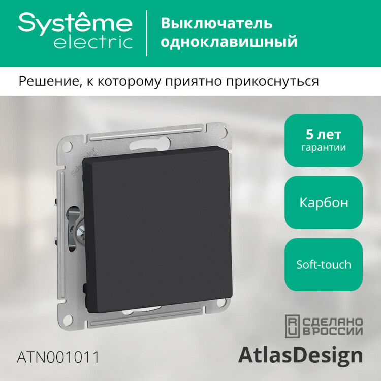 Механизм Systeme Electric (ранее Schneider Electric) серии AtlasDesign в цвете карбон выключателя 1-клавишного подходит для сетей 250 В, на ток 10 А. Лицевые детали из качественного ABS-пластика, устойчивого к царапинам и УФ-излучению. Благодаря покрытию «soft touch» к изделию приятно прикасаться. Усиленные прямые монтажные лапки для лучшей фиксации механизма в монтажной коробке. (ранее Schneider Electric ЭУИ UNICA, ЭУИ UNICA NEW MGU5.201.12ZD, NU520154)