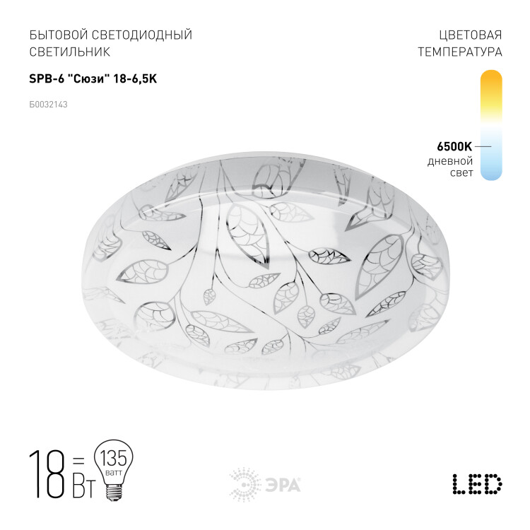 Мощность в 18 Вт и срок службы в 30 000 часов позволят использовать электросветильник SPB-6 "Сюзи" долгое время. Примите верное решение и купите люстру от бренда ЭРА.