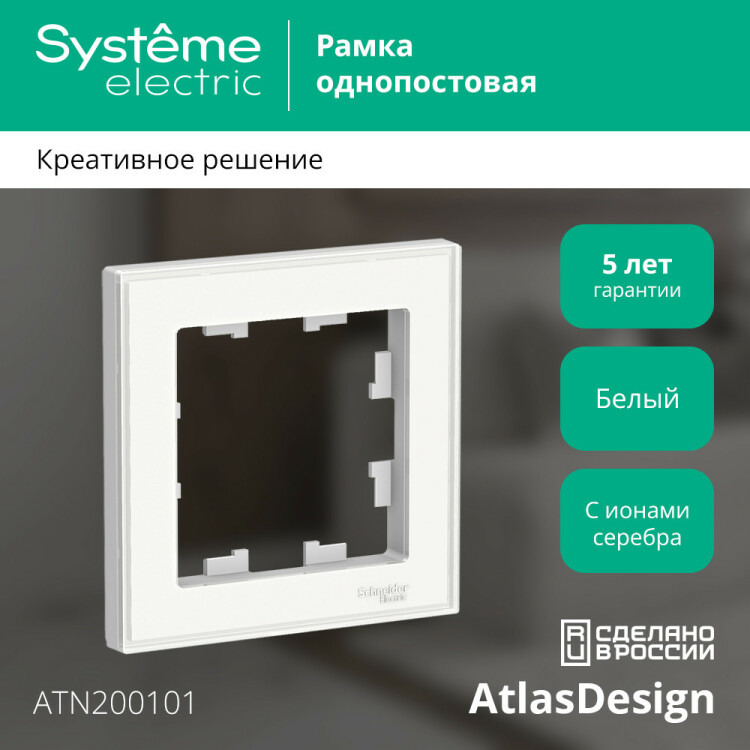 Рамка Systeme Electric (ранее Schneider Electric) серии AtlasDesign Art (цвет белый) одинарная. Лицевые детали из качественного ABS-пластика, устойчивого к царапинам и УФ-излучению. Позволяет гармонично вписать электроустановочное изделие в интерьер помещения и создать свой собственный дизайн путем помещения под прозрачную накладку рисунка, фотографии, обоев, ткани и т.д.