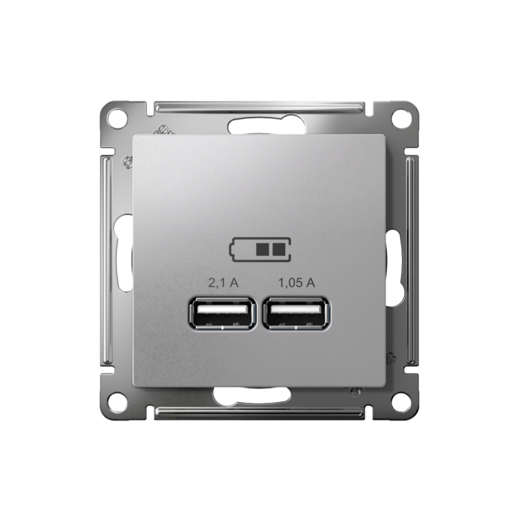 Механизм Systeme Electric (ранее Schneider Electric) серии AtlasDesign в цвете алюминий розетки для зарядки с двумя разъёмами USB, с выходным напряжением 5 В постоянного тока и выходами с номинальным током по 2,1 А. USB розетка позволяет напрямую заряжать одно или два мобильных устройства. Лицевые детали из качественного ABS-пластика, устойчивого к царапинам и УФ-излучению. Усиленные прямые монта жные лапки для лучшей фиксации механизма в монтажной коробке. (ранее Schneider Electric ЭУИ UNICA NEW NU541830)