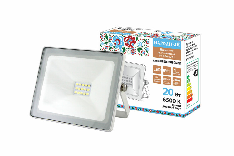Прожектор светодиодный СДО-04-020Н 20 Вт, 6500 К, IP65, белый, Народный (кр.1шт)