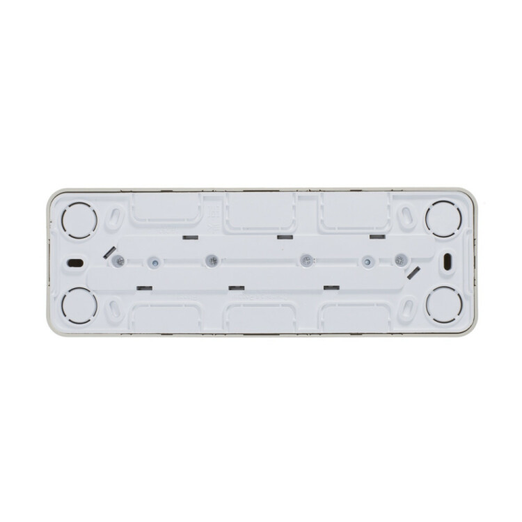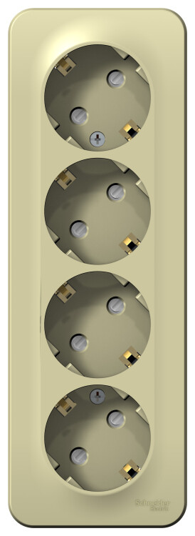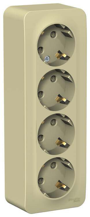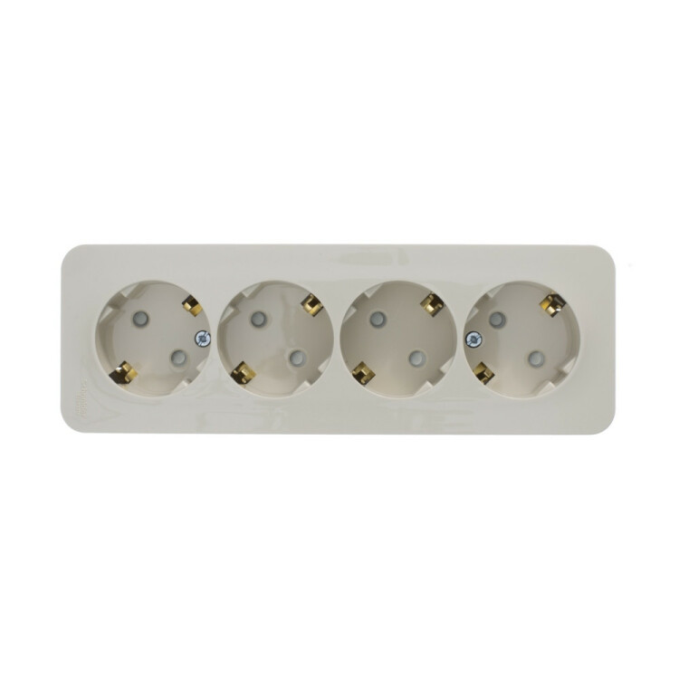 Розетка Systeme Electric (ранее Schneider Electric) BLANCA (открытой установки, цвет бежевый) четырёхместная с заземлением и шторками, с изолирующей пластиной подходит для сетей 250 В, на ток 16 А. Заземляющий контакт обеспечивает дополнительную защиту от удара электрическим током. При наличии заземления электрический потенциал уходит в землю, защищая человека. Входные отверстия расположены под угло м 45 градусов, благодаря чему можно подключить несколько устройств: вилки и адаптеры не будут мешать друг другу. Корпус изделия выполнен из ABS-пластика.