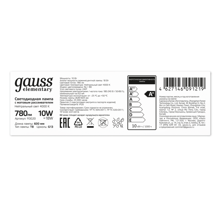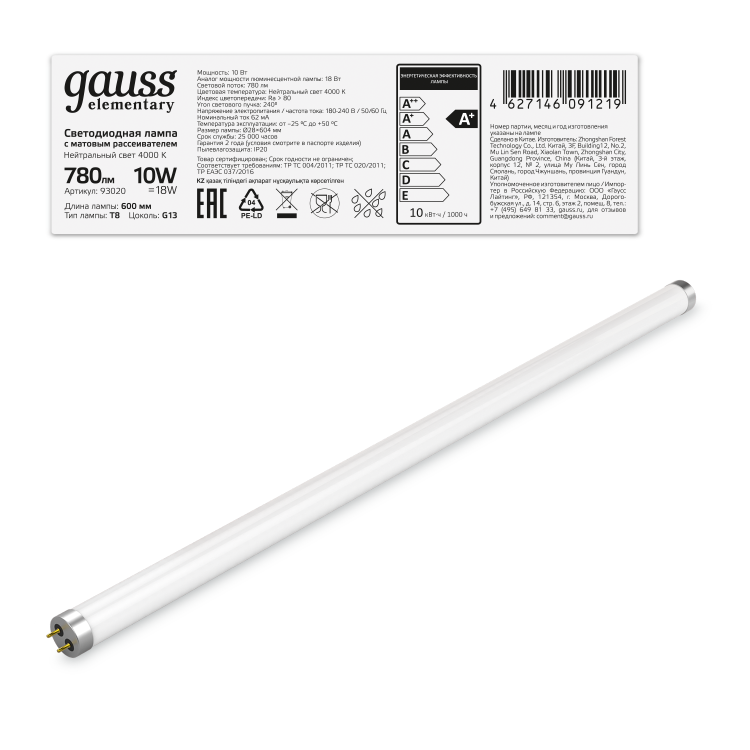 Линейные лампы Gauss T8 с цоколем G13 - выгодная замена стандартных люминесцентных ламп. Замена безопасна и не требует менять светильники – длина ламп светодиодных соответствует установленным стандартам
