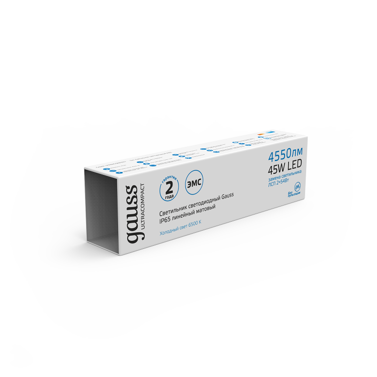 Светильник светодиодный Gauss Ultracompact IP65 линейный матовый 45w изготовлен из прочного АВС пластика и опалового пластикового рассеивателя с высокой степенью герметичности всех частей, в том числе и соединений, которые производятся с помощью особого гермоввода. Кроме того у этой модели есть возможность линейного соединения до 20 штук светильников в одну линию при необходимости освещения больших складских или производственных площадей, подземных парковок, автомоек, цехов, тепличных хозяйств. Монтируется накладным способом. Уровень освещенности 4550лм, цветовая температура 6500К.