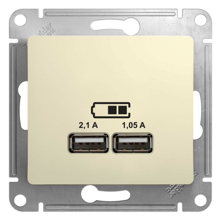 Механизм Systeme Electric (ранее Schneider Electric) серии Glossa (цвет бежевый) розетки с двумя разъёмами USB с выходными напряжением 5 В постоянного тока и выходами с номинальным током по 2,1 А. Предназначен для зарядки мобильных устройств: телефоны, планшетные компьютеры, mp3/mp4 плееры. Может заряжать одно или два устройства одновременно. Выполнен из материала PС+ASA, стойкого к УФ-излучению и появлению царапин. (ранее Schneider Electric ЭУИ UNICA, ЭУИ UNICA NEW MGU5.418.25ZD, NU541844)