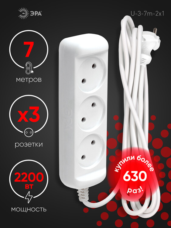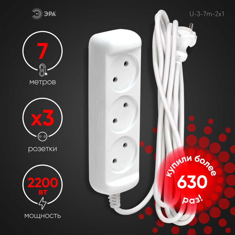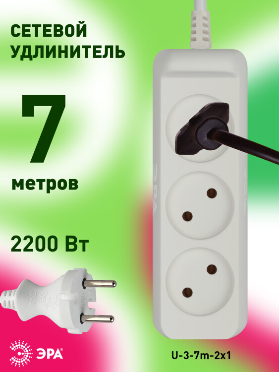 Удлинитель электрический Эра U-3-7m без заземления, ПВС, 2x1мм2, 3 розетки, 7м. Рассчитан на максимальную мощность 10А/2200 Вт. Удлинитель Эра станет Вашим надежным помощником, если Ваши любимые электроприборы находятся далеко от розеток. Провод в удлинителях Эра сделан из 100% меди, что делает его абсолютно пожаробезопасным. Корпус выполнен из ударопрочного и негорючего пластика (полипропилен). В моделях с заземлением у вилки есть кольцо для удобного извлечения из розетки. Модель удлинителя на 10А позволяет подключить мощные бытовые приборы общей нагрузкой до 2200Вт. Не бойтесь включить чайник, обогреватель, микроволновку или другие электроприборы. Толстый провод удлинителя Эра гарантирует полную безопасность. Дизайн удлинителя разработан в России командой Эра Style.