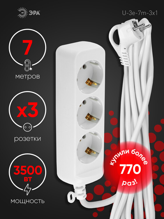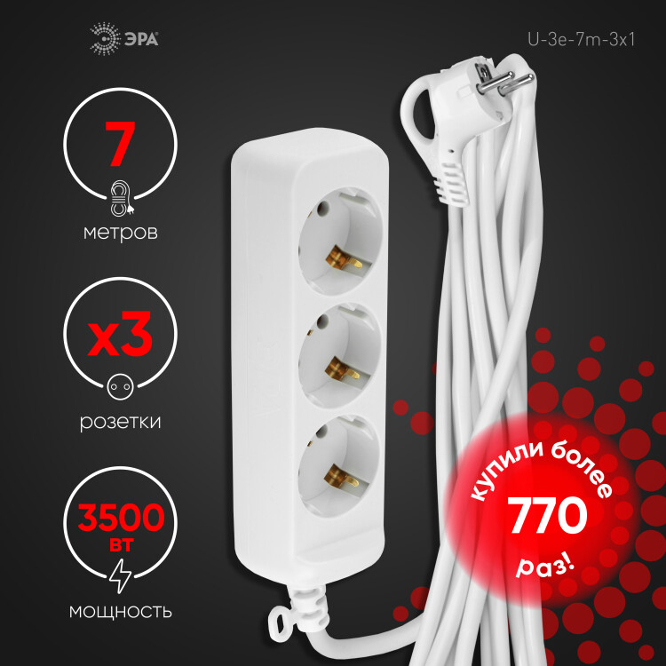 Удлинитель электрический Эра U-3e-7m-3x1 с заземлением, ПВС, 3x1мм2, 3 розетки, 7м. Рассчитан на максимальную мощность 16А/3500 Вт. Удлинитель Эра станет Вашим надежным помощником, если Ваши любимые электроприборы находятся далеко от розеток. Провод в удлинителях Эра сделан из 100% меди, что делает его абсолютно пожаробезопасным. Корпус выполнен из ударопрочного и негорючего пластика (полипропилен). В моделях с заземлением у вилки есть кольцо для удобного извлечения из розетки. Модель удлинителя на 16А позволяет подключить мощные бытовые приборы общей нагрузкой до 3500Вт. Не бойтесь включить чайник, обогреватель, микроволновку или другие электроприборы. Толстый провод удлинителя Эра гарантирует полную безопасность. Дизайн удлинителя разработан в России командой Эра Style.