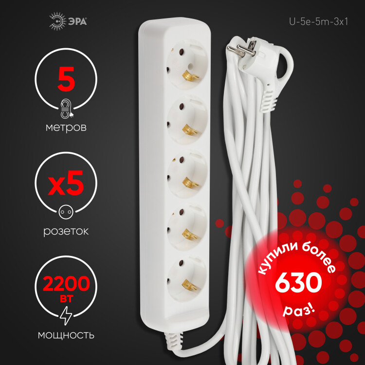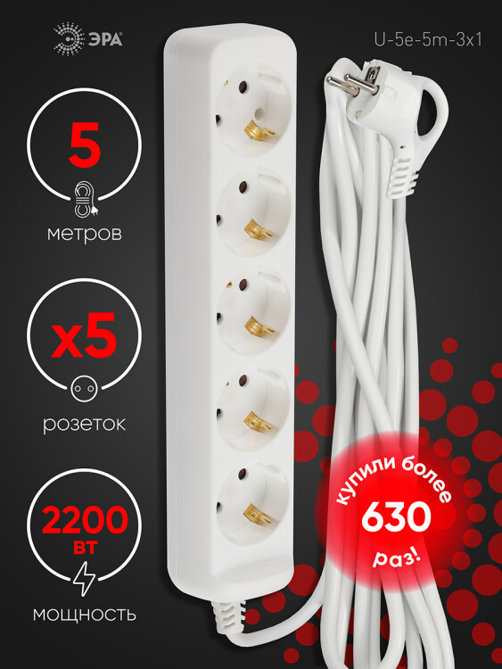 Удлинитель электрический Эра U-5e-5m-3x1 с заземлением, ПВС, 3x1мм2, 5 розеток, 5 м. Рассчитан на максимальную мощность 16А/3500 Вт. Удлинитель Эра станет Вашим надежным помощником, если Ваши любимые электроприборы находятся далеко от розеток. Провод в удлинителях Эра сделан из 100% меди, что делает его абсолютно пожаробезопасным. Корпус выполнен из ударопрочного и негорючего пластика (полипропилен). В моделях с заземлением у вилки есть кольцо для удобного извлечения из розетки. Модель удлинителя на 16А позволяет подключить мощные бытовые приборы общей нагрузкой до 3500Вт. Не бойтесь включить чайник, обогреватель, микроволновку или другие электроприборы. Толстый провод удлинителя Эра гарантирует полную безопасность. Дизайн удлинителя разработан в России командой Эра Style.