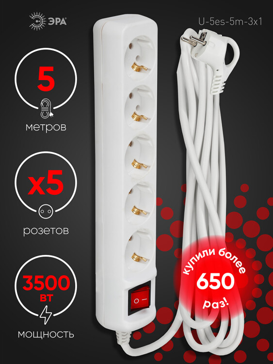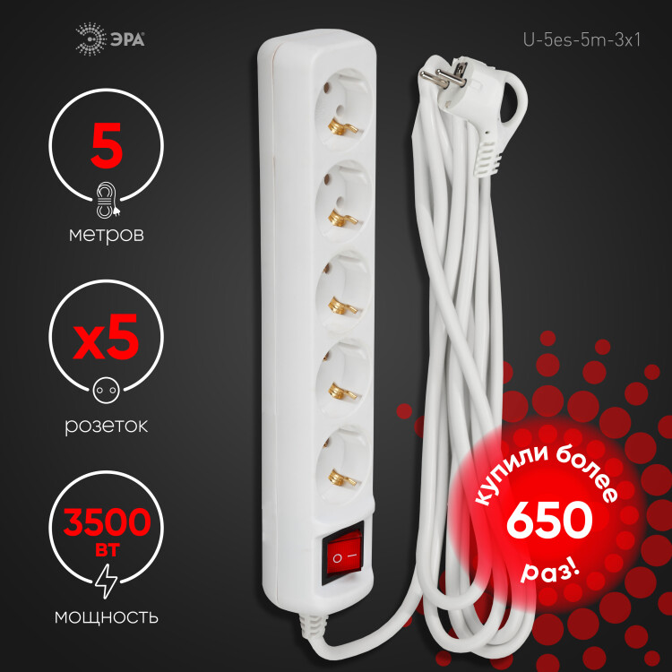 Удлинитель электрический Эра U-5es-5m-3x1 с заземлением, с выключателем, ПВС, 3x1мм2, 5 розетки, 5 м. Рассчитан на максимальную мощность 16А/3500 Вт. Удлинитель Эра станет Вашим надежным помощником, если Ваши любимые электроприборы находятся далеко от розеток. Провод в удлинителях Эра сделан из 100% меди, что делает его абсолютно пожаробезопасным. Корпус выполнен из ударопрочного и негорючего пластика (полипропилен). В моделях с заземлением у вилки есть кольцо для удобного извлечения из розетки. Модель удлинителя на 16А позволяет подключить мощные бытовые приборы общей нагрузкой до 3500Вт. Не бойтесь включить чайник, обогреватель, микроволновку или другие электроприборы. Толстый провод удлинителя Эра гарантирует полную безопасность. Дизайн удлинителя разработан в России командой Эра Style.