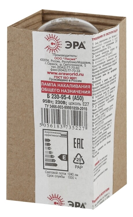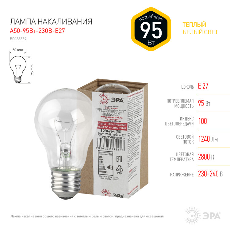 Лампа накаливания ЭРА A50 95Вт 230В E27 прозр. в гофре.Б 230-90-4 (100/3600) | Б0033369