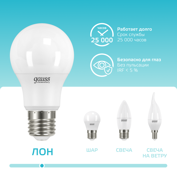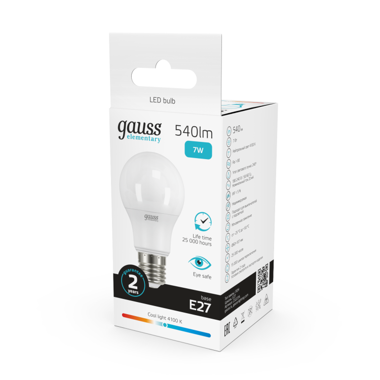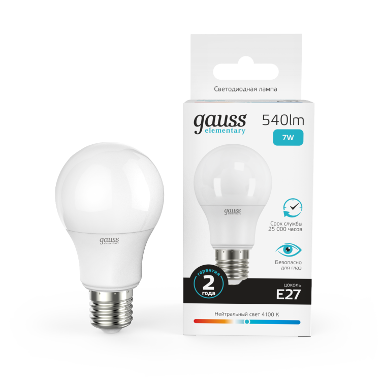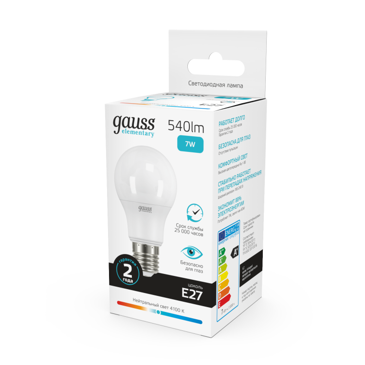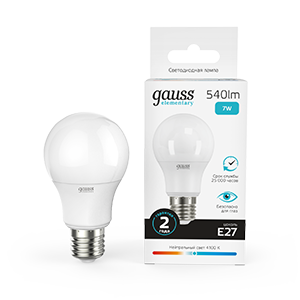 Лампа Gauss Elementary A60 расходует всего 7 ватт электроэнергии для создания светового потока в 540 люмен. Хорошее решение, что бы сэкономить свои и природные ресурсы, не снижая качество освещения небольшого помещения ниже комфортного уровня. Яркость светового потока с температурой 4100К будет достаточной для выполнения различных задач в атмосфере уюта.
