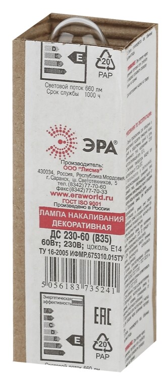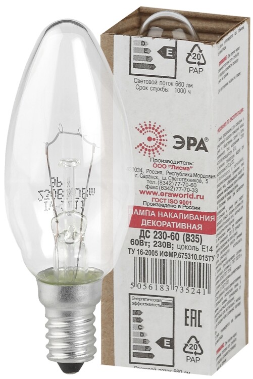 Лампа накаливания вольфрамовая для бытового и аналогичного общего освещения. Лампа с колбой в виде свечи используется для декоративного оформления светильника, придания ему законченного и совершенного вида. Она красиво смотрится, создавая эффект настоящей зажженной свечи, что привносит в интерьер комнаты более уютный, успокаивающий и "теплый" вид. Прозрачная колба лампы создана специально для эффектов абсолютно чистого, искрящегося света.
