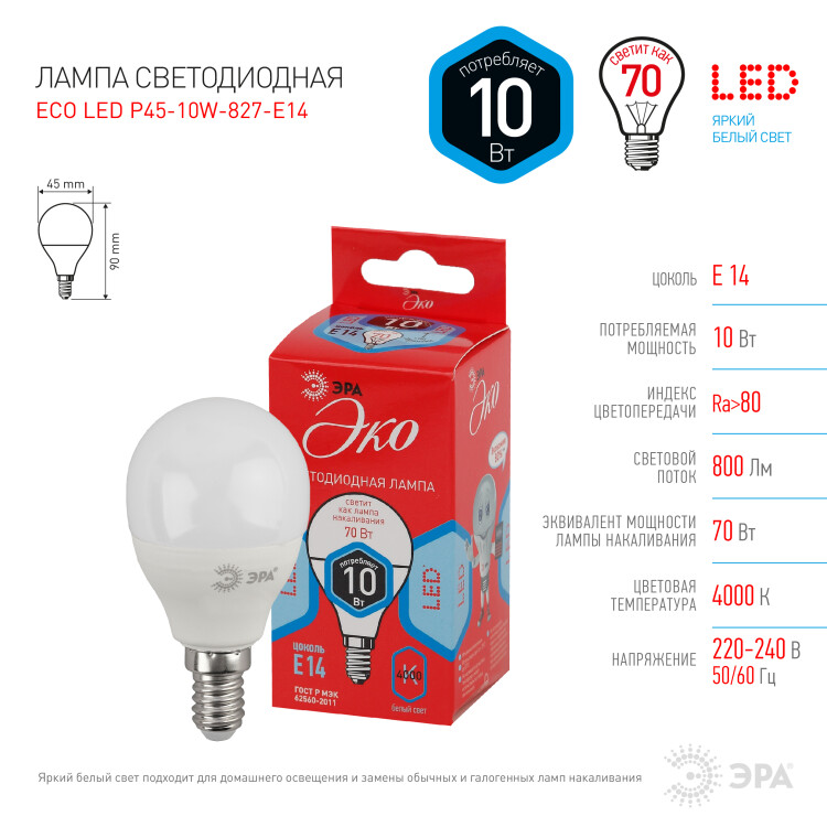 Эта светодиодная лампа ЭРА Серии Бюджет - современный, качественный и доступный источник света. Позволяет экономить до 90% электроэнергии по сравнению с лампой накаливания с аналогичным световым потоком. Светит ярким белым светом, который максимально приближен к естественному дневному. Идеальна для ежедневного применения в быту. Мгновенное включение. Ровное освещение. Можно использовать как с люстрами, так и со светильниками, в том числе настольными и бра.
