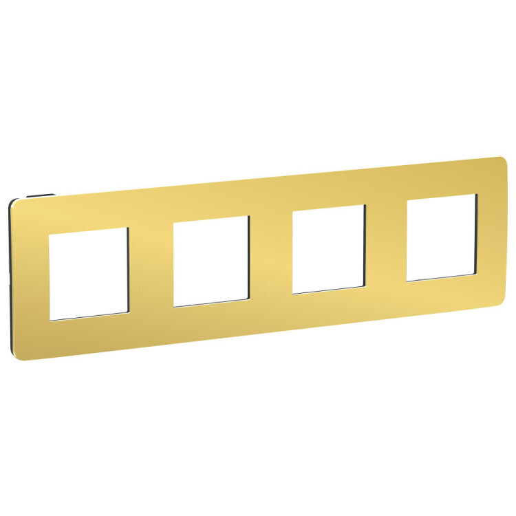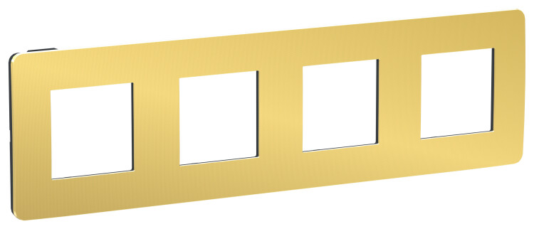 Рамка Schneider Electric UNICA STUDIO Metal (золото) четырёхместная с задней панелью цвета антрацит.