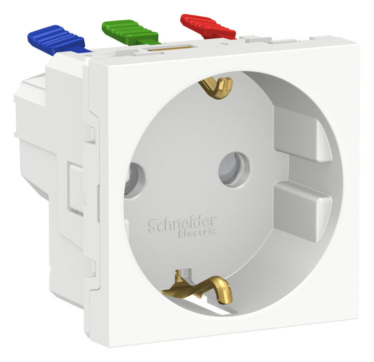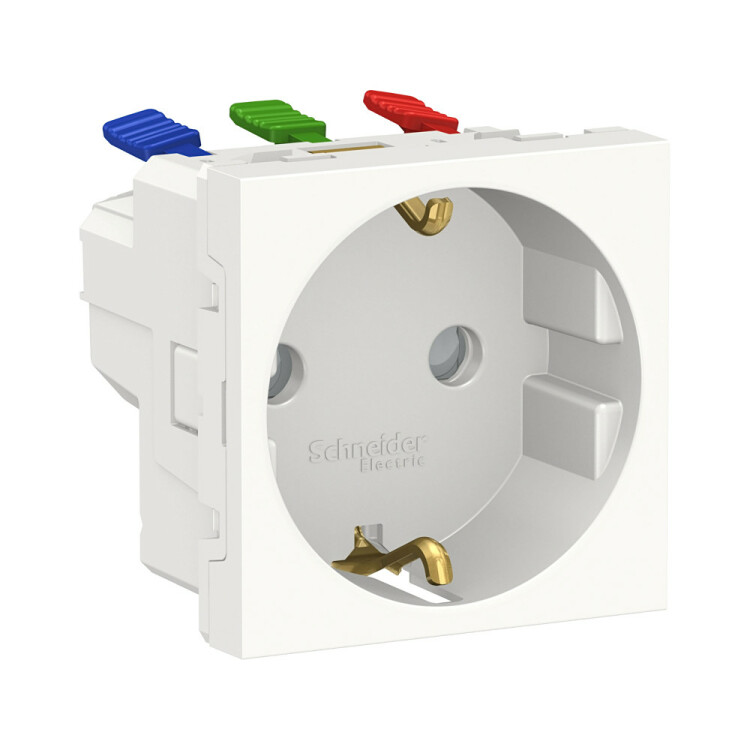 Розетка Schneider Electric UNICA NEW (белый) одинарная с заземлением, со шторками, с быстрозажимными клеммами предназначена для сетей до 250 В на ток до 16 А.