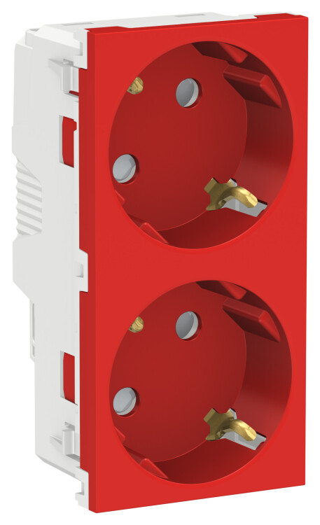 Розетка Schneider Electric UNICA NEW (красный) двойная с заземлением, со шторками, с винтовыми зажимами предназначена для сетей до 250 В на ток до 16 А.