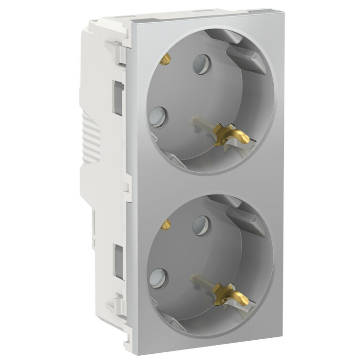 Розетка Schneider Electric UNICA NEW (алюминий) двойная с заземлением, со шторками, с винтовыми зажимами предназначена для сетей до 250 В на ток до 16 А.