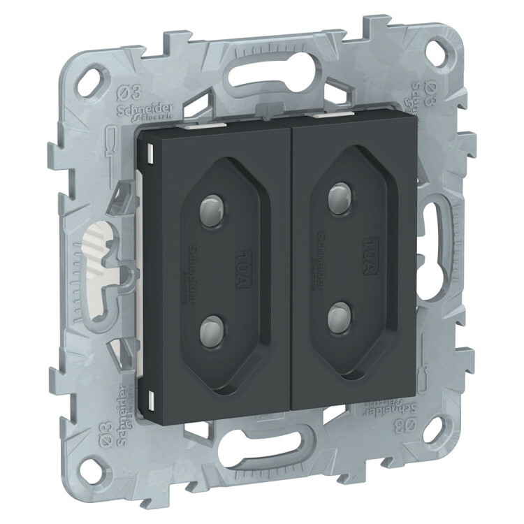 Розетка двухмодульная Schneider Electric UNICA NEW (антрацит) без заземления, со шторками, с винтовыми зажимами предназначена для сетей до 250 В на ток до 10 А.