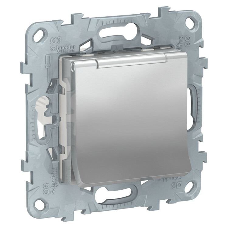 Розетка Schneider Electric UNICA NEW (алюминий) с заземлением, со шторками, с крышкой предназначена для сетей до 250 В на ток до 16 А.