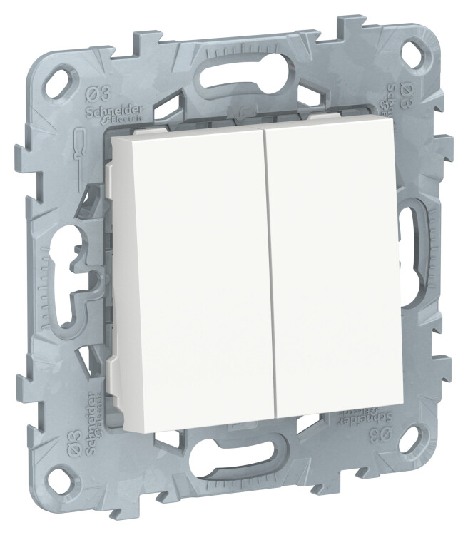 Переключатель двухклавишный Schneider Electric UNICA NEW (белый) без подсветки предназначен для сетей до 250 В на ток до 10 А.