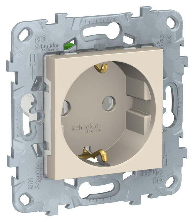 Розетка Schneider Electric UNICA NEW (бежевый) с заземлением, без шторок, с быстрозажимными клеммами предназначена для сетей до 250 В на ток до 16 А.