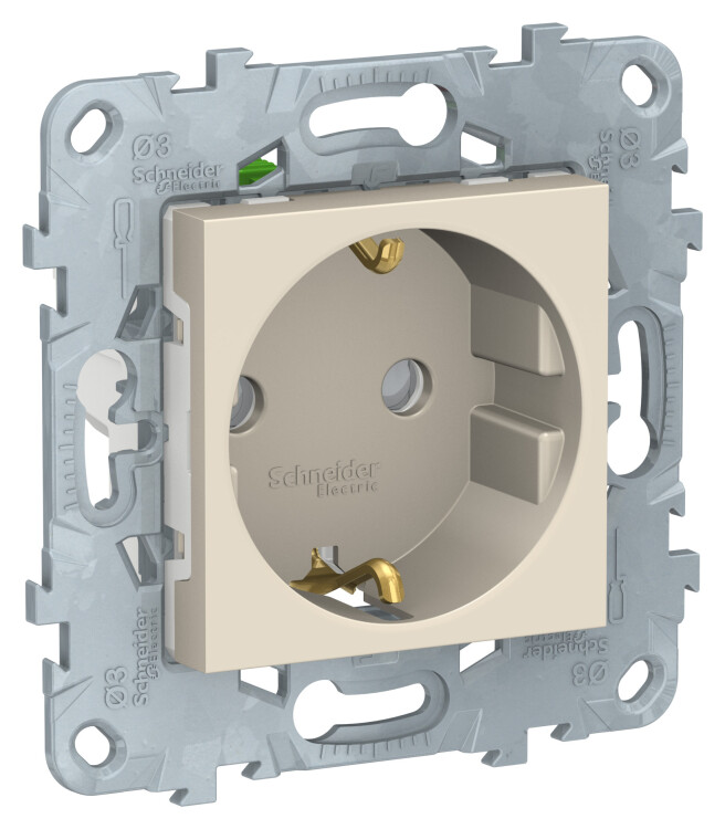 Розетка Schneider Electric UNICA NEW (бежевый) с заземлением, со шторками, с быстрозажимными клеммами предназначена для сетей до 250 В на ток до 16 А.