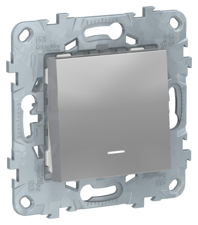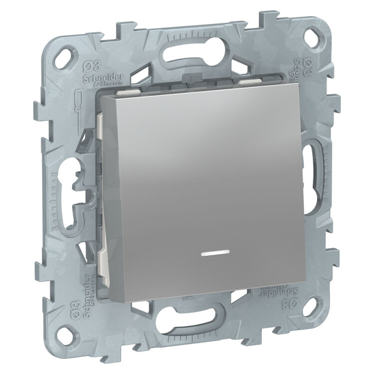 Выключатель одноклавишный Schneider Electric UNICA NEW (алюминий) с подсветкой предназначен для сетей до 250 В на ток до 10 А.
