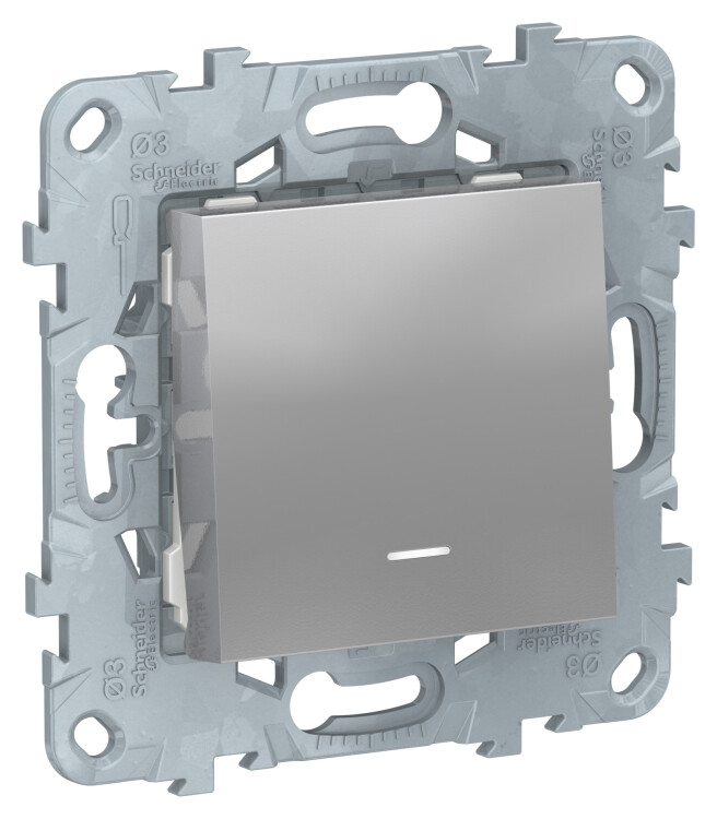 Переключатель одноклавишный Schneider Electric UNICA NEW (алюминий) с подсветкой предназначен для сетей до 250 В на ток до 10 А.